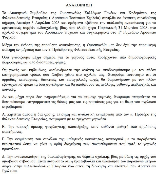Aνακοίνωση του Συλλόγου Γονέων και Κηδεμόνων της Φιλεκπαιδευτικής εταιρίας μετά το άγριο περιστατικό