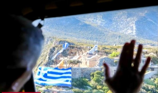 Ο αγιορείτης μοναχός Πατέρας Ιωσήφ στο ησυχαστήριο του Αγίου Μηνά κρατάει στην άκρη του βράχου την Ελληνική σημαία, χαιρετώντας τους πιλότους των ενόπλων δυνάμεων και δίνοντάς τους την ευλογία του.