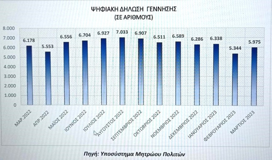 Ως προς τις ληξιαρχικές πράξεις γέννησης, τον Μάρτιο 2023 εκδόθηκαν συνολικά 7.443 ληξιαρχικές πράξεις γέννησης. Εξ αυτών, 6.015 εκδόθηκαν από τα οικεία ληξιαρχεία της χώρας, 54 από το ειδικό ληξιαρχείο Αθηνών και 1.374 από τα προξενεία της Ελλάδος στο εξωτερικό.
