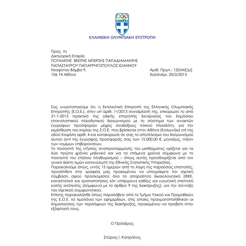 Η ερώτηση στον κ. Καπράλο είναι απλή: Γιατί η Ελληνική Ολυμπιακή Επιτροπή δεν εισπράττει τα τελευταία δέκα χρόνια το σύνολο του μισθώματος από την Κομισιόν και μίσθωσε το ακίνητο στην έγκριτη δικηγορική φίρμα, η οποία ως εκ του αποτελέσματος κέρδισε πολλαπλώς από την υπεκμίσθωση;