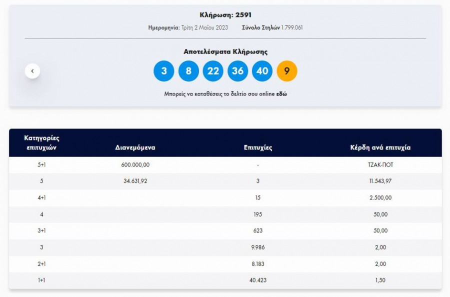 Οι τυχεροί αριθμοί που έβγαλε η κληρωτίδα της αποψινής κλήρωσης ήταν οι: 22, 8, 40, 36, 3 και αριθμός Τζόκερ 9.