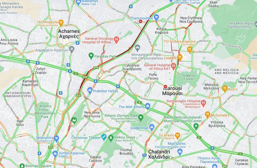 Ιδιαίτερα αυξημένη είναι η κίνηση και στους δρόμους γύρω από το κέντρο, αλλά και στα νότια προάστια, στην παραλιακή, κυρίως στο ύψος του Αλίμου και στον Πειραιά.