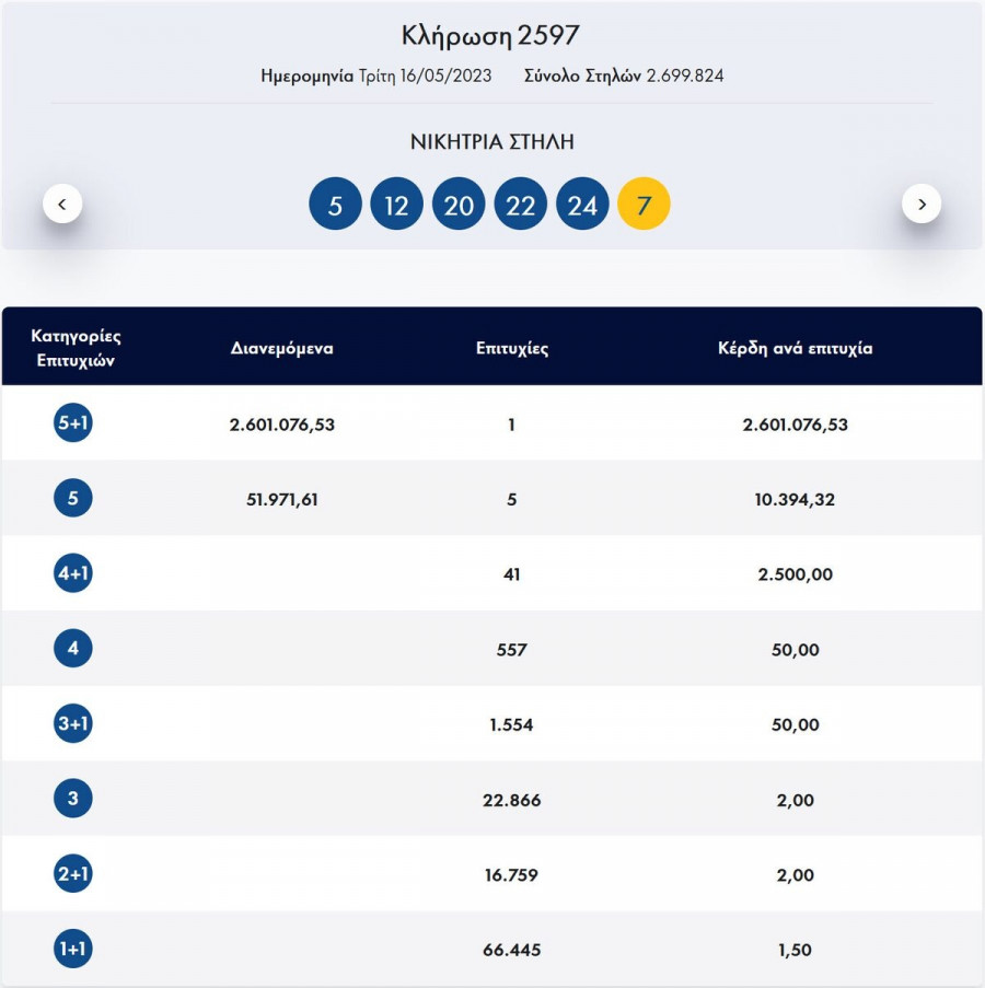 Ένα τυχερό δελτίο βρέθηκε στην 1η κατηγορία (5+1) κατά τη διαλογή της 2597ης κλήρωσης του Τζόκερ που κερδίζει το ποσό των 2.601.076,53 ευρώ. Παράλληλα το δελτίο φέρει και δύο επιτυχίες στη 2η κατηγορία όπου η κάθε επιτυχία κερδίζει από 10.394,32 ευρώ.