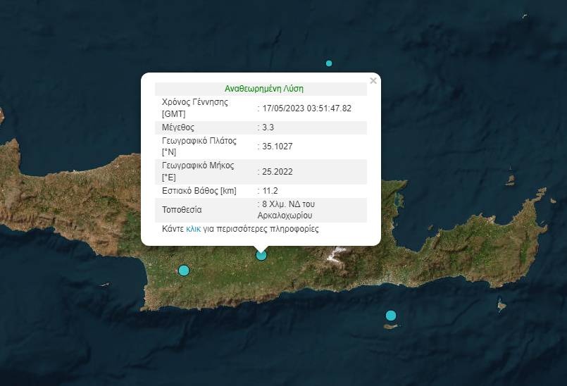 Σύμφωνα με το Γεωδυναμικό Ινστιτούτο Αθηνών ο σεισμός ήταν 3,3 Ρίχτερ και 8 χιλιόμετρα Νοτιοδυτικά του Αρκαλοχωρίου.