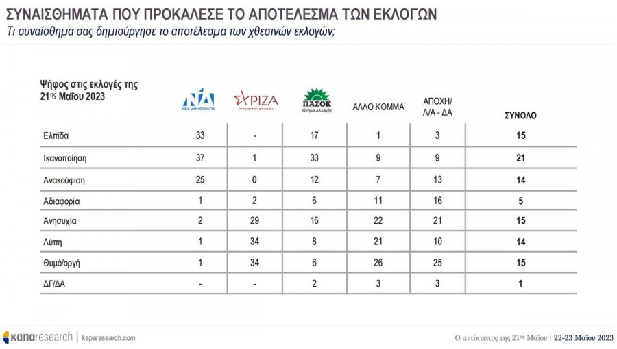 Σε κάθε περίπτωση, πάντως, την Τρίτη (23/5) δημοσιεύτηκε η πρώτη δημοσκόπηση μετά τις Εκλογές 2023, στην οποία αποτυπώνονται τα πρώτα συναισθήματα των πολιτών μετά τα αποτελέσματα της Κυριακής (21/5). Οι ερωτήσεις αφορούν το πως είδαν οι πολίτες τη νίκη της ΝΔ, αν επιθυμούν αυτοδυναμία ή κυβέρνηση συνεργασίας μετά τις δεύτερες εκλογές αλλά και τι θα πρέπει να γίνει στον χώρο της αξιωματικής αντιπολίτευσης, εκεί όπου ήδη έχουν βγει τα «μαχαίρια» ανάμεσα σε ΣΥΡΙΖΑ και ΠΑΣΟΚ.