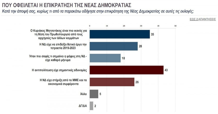 Στην ερώτηση γιατί επικράτησε η Νέα Δημοκρατία, η απάντηση θα πρέπει να προκαλέσει περισσότερο προβληματισμό στον ΣΥΡΙΖΑ. Αυτό διότι ένα 43% ανέφερε ότι η αντιπολίτευση είχε σημαντικές αδυναμίες ενώ ένα 35% θεωρεί ικανότερο τον Κυριάκο Μητσοτάκη από τους αρχηγούς των άλλων κομμάτων.