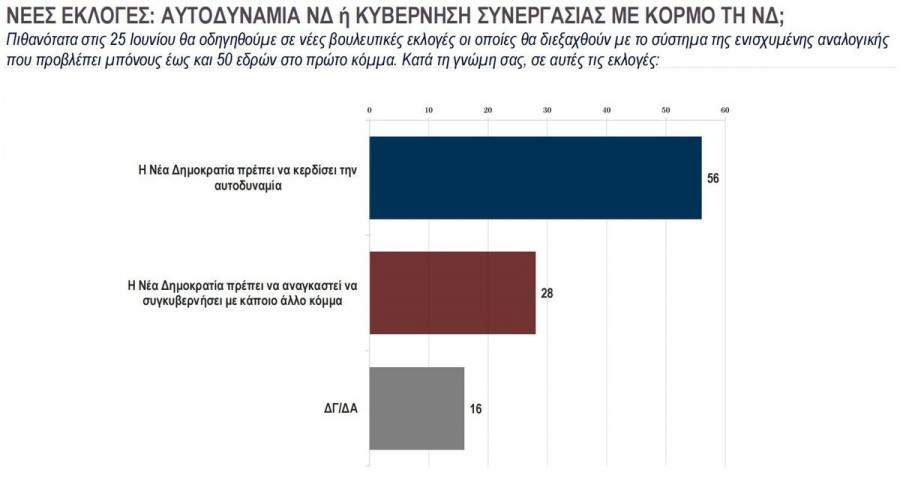 Στην ερώτηση για τις δεύτερες εκλογές στις 25 Ιουνίου, οι πολίτες απάντησαν κατά 56% πως επιθυμούν αυτοδυναμία της Νέας Δημοκρατίας, ενώ μόλις το 28% έκανε λόγο για συγκυβέρνηση της Νέας Δημοκρατίας με άλλο κόμμα.