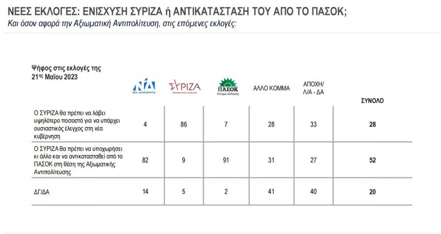 Θετική για το ΠΑΣΟΚ και αρνητική για τον ΣΥΡΙΖΑ είναι και η ερώτηση για το ποιο από τα δύο κόμματα, επί της ουσίας, θα πρέπει να έχει τον ρόλο της αξιωματικής αντιπολίτευσης. Το 52% των ερωτηθέντων επιζητά ενίσχυση του ΠΑΣΟΚ και υποχώρηση του ΣΥΡΙΖΑ, ενώ μόλις το 28% επιθυμεί ο ΣΥΡΙΖΑ να λάβει υψηλότερο ποσοστό για να ελέγχει την κυβέρνηση.