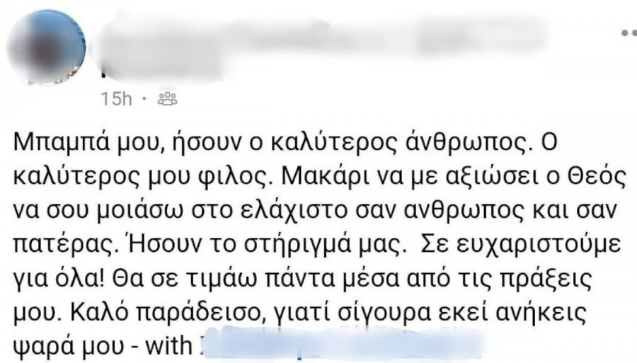 «Μπαμπά μου, ήσουν ο καλύτερος άνθρωπος. Ο καλύτερος μου φίλος. Μακάρι να με αξιώσει ο Θεός να σου μοιάσω στο ελάχιστο σαν άνθρωπος και σαν πατέρας. Ήσουν το στήριγμά μας. Σε ευχαριστούμε για όλα! Θα σε τιμάω πάντα μέσα από τις πράξεις μου. Καλό παράδεισο, γιατί σίγουρα εκεί ανήκεις ψαρά μου».