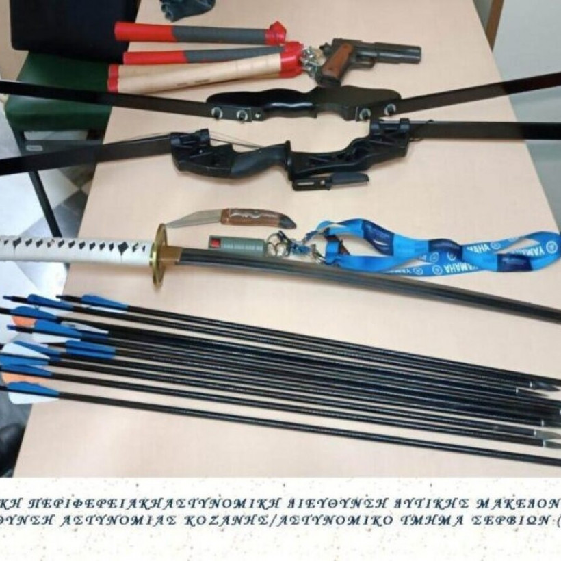 «Από αστυνομικούς του Αστυνομικού Τμήματος Σερβίων, συνελήφθη άμεσα κατόπιν οργανωμένης αστυνομικής επιχείρησης 49χρονος ημεδαπός, για απόπειρα ανθρωποκτονίας, σε βάρος 52χρονου ημεδαπού με τη χρήση ξίφους, σε περιοχή της Κοζάνης, ενώ κατά τη διάρκεια της σύλληψής του επιτέθηκε με ξίφος, τόξο, βέλη και σπρέι πιπεριού σε βάρος και των προαναφερόμενων αστυνομικών. Σε βάρος του 49χρονου σχηματίσθηκε δικογραφία και για τα αδικήματα της βίας κατά υπαλλήλων και δικαστικών προσώπων, της απείθειας, της απειλής, της εξύβρισης και της νομοθεσίας περί όπλων. Ειδικότερα, σήμερα (28-05-2023) τις πρώτες πρωινές ώρες σε κατάστημα υγειονομικού ενδιαφέροντος σε περιοχή της Κοζάνης, ο 49χρονος επιτέθηκε με τη χρήση ξίφους σε 52χρονο ημεδαπό, θαμώνα του καταστήματος, πλην όμως δεν κατάφερε να τον τραυματίσει, ενώ εξύβρισε άλλους -6- θαμώνες του καταστήματος και στη συνέχεια απομακρύνθηκε από το κατάστημα. Άμεσα κινητοποιήθηκαν αστυνομικές δυνάμεις, όπου εντοπίσθηκε ο 49χρονος στην οικία του σε περιοχή της Κοζάνης, ο οποίος στη θέα των αστυνομικών αρχικά τους απείλησε με ξίφος, στη συνέχεια έριξε προς το μέρος αυτών τουλάχιστον -7- βέλη με τη χρήση τόξου, ενώ ακολούθως τους επιτέθηκε με σπρέι πιπεριού, επιχειρώντας να τους τραυματίσει. Αστυνομικοί παρά τις επαναλαμβανόμενες σε βάρος τους επιθέσεις κατάφεραν να ακινητοποιήσουν τον 49χρονο, ενώ κατά τη διάρκεια της σύλληψης τραυματίσθηκαν ελαφρά -2- αστυνομικοί. Στην κατοχή του 49χρονου και στην οικία του, σε περιοχή της Κοζάνης, βρέθηκαν συνολικά και κατασχέθηκαν: · -1- απομίμηση όπλου, · -1- ξίφος μήκους λάμας -70- εκατοστών, · -1- σουγιάς μήκους λάμας -10- εκατοστών, · -2- τόξα, · -1- φαρέτρα με -10- βέλη, · -2- ζευγάρια κρόταλα και · -2- σπρέι πιπεριού. Ο συλληφθείς, με τη δικογραφία που σχηματίσθηκε σε βάρος του, θα οδηγηθεί στην κα. Εισαγγελέα Πλημμελειοδικών Κοζάνης, ενώ προανάκριση για την υπόθεση ενήργησε το Αστυνομικό Τμήμα Σερβίων».