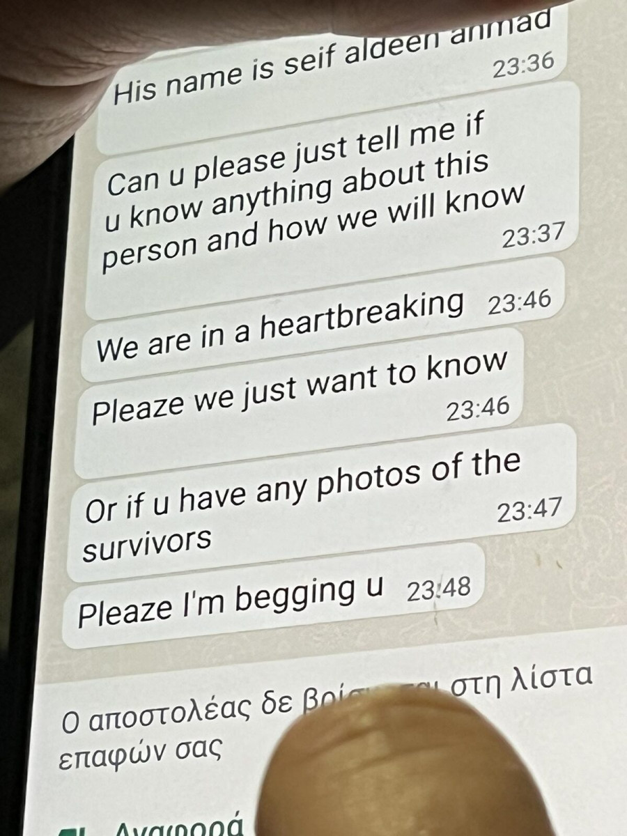 «Το όνομά του είναι Seif Aldeen Ahmad. Μπορείτε σας παρακαλώ να μου πείτε αν γνωρίζετε κάτι για αυτόν και πώς θα μάθουμε κάτι. Η καρδιά μας πάει να σπάσει. Παρακαλούμε, απλά θέλουμε να ξέρουμε. Ή αν έχετε φωτογραφίες των επιζώντων. Σας εκλιπαρούμε».
