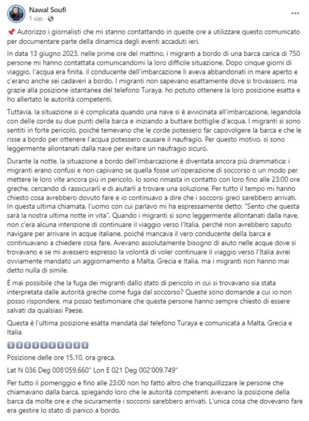 Η Ναουάλ Σουφί είναι μία ακτιβίστρια η οποία σε μία ανάρτησή της στο Facebook δήλωσε πως είναι η πρώτη που ενημέρωσε τόσο ιταλικές όσο και τις ελληνικές αρχές για το πλοίο στο οποίο επενέβαιναν οι μετανάστες και βυθίστηκε τελικά σε διεθνή ύδατα.