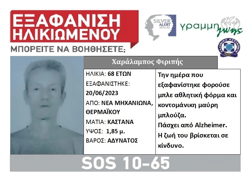 Συγκεκριμένα, πρόκειται για τον Χαράλαμπο Φιριπή, ο οποίος εξαφανίστηκε από το σπίτι του, στη Νέα Μηχανιώνα Θερμαϊκού, την περασμένη Τρίτη 20/06/23.