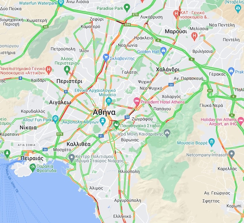 Η κίνηση στο ρεύμα της ανόδου στον Κηφισό ξεκινά από το ύψος της Λένορμαν και καταλήγει στην Αχαρνών, ενώ στο ρεύμα προς Πειραιά, χαμηλές ταχύτητες καταγράφονται από το ύψος της Αττικής Οδού μέχρι και τα ΚΤΕΛ. Και επί της Αθηνών – Κορίνθου η κίνηση είναι αυξημένη και στα δύο ρεύματα.