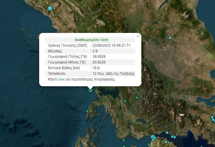 Ο σεισμός είχε εστιακό βάθος 16,8 χλμ και επίκεντρο 12 χλμ βορειοδυτικά της Πρέβεζας.