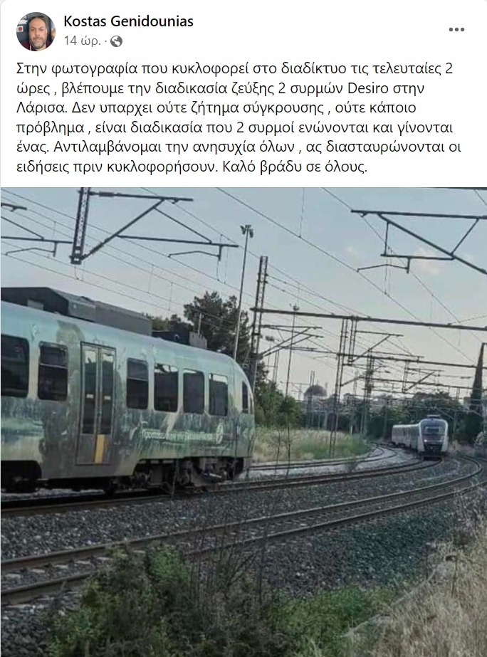 Λάρισα: Λανθασμένες αναφορές για σύγκρουση τρένων που αποφεύχθηκε την τελευταία στιγμή, καθώς όπως εξήγησαν οι αρμόδιοι τα τρένα που κινούνταν στις ίδιες ράγες ήταν σε διαδικασία σύζευξης.