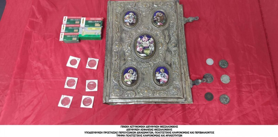 Σύμφωνα με την Αστυνομία, κατά τη διάρκεια επιχείρησης που πραγματοποιήθηκε χθες το πρωί σε κοσμηματοπωλείο ιδιοκτησίας του συλληφθέντα στο κέντρο της Θεσσαλονίκης βρέθηκαν ιερό ευαγγέλιο παλαιού τύπου και βεβαίωση παραλαβής για αυτό στην οποία αναγράφονταν τα στοιχεία 78χρονου και 242 νομίσματα.