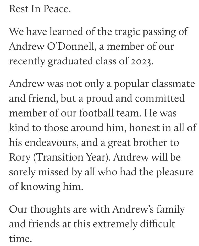 «Αναπαύσου εν ειρήνη. Μάθαμε για τον τραγικό θάνατο του Andrew O’Donnell, μαθητής της τάξης μας, που αποφοίτησε το 2023. Ο Andrew δεν ήταν μόνο ένας δημοφιλής συμμαθητής και φίλος, αλλά ένα περήφανο και αφοσιωμένο μέλος της ποδοσφαιρικής μας ομάδας. Ήταν ευγενικός, ειλικρινής και σπουδαίος αδερφός για τον Ρόρι. Ο Άντριου θα λείψει πολύ σε όλους όσοι είχαν τη χαρά να τον γνωρίσουν. Οι σκέψεις μας είναι με την οικογένεια και τους φίλους του Andrew σε αυτήν την εξαιρετικά δύσκολη στιγμή».