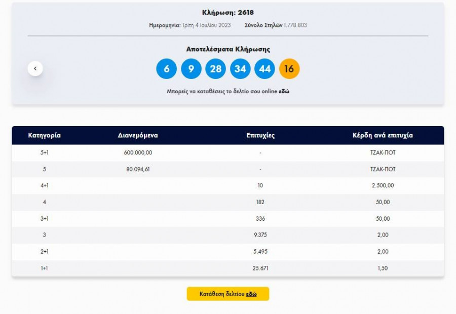 Ως αποτέλεσμα του αποψινού τζακ ποτ το Τζόκερ θα μοιράσει στου μεγάλους νικητές της ερχόμενης κλήρωση της Τρίτης Πέμπτη (6/7) τουλάχιστον 750.000 ευρώ!
