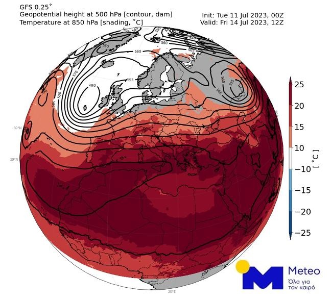 Σύμφωνα με το επικαιροποιημένο Έκτακτο Δελτίο Επικίνδυνων Καιρικών Φαινομένων (ΕΔΕΚΦ) από την Εθνική Μετεωρολογική Υπηρεσία (ΕΜΥ), το εκτεταμένο πεδίο υψηλών πιέσεων που καλύπτει τις ακτές της Αφρικής και τη Δυτική και Κεντρική Μεσόγειο και συνοδεύεται από πολύ θερμές αέριες μάζες επεκτείνεται σταδιακά ανατολικότερα και προκαλεί συνθήκες καύσωνα από την Τετάρτη (12-7-2023) έως και τις αρχές της επόμενης εβδομάδας.
