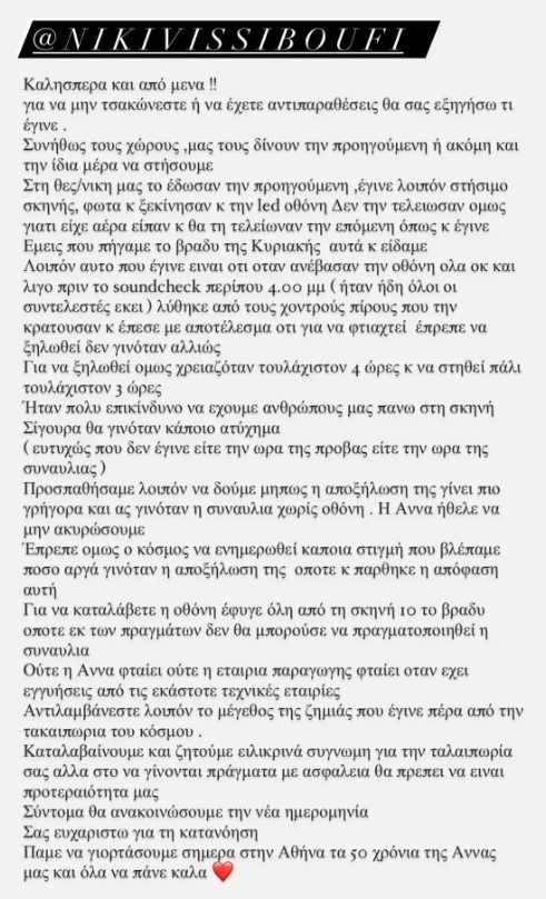 Ούτε η Άννα φταίει, ούτε η εταιρεία παραγωγής φταίει όταν έχει εγγυήσεις από τις εκάστοτε τεχνικές εταιρείες. Αντιλαμβάνεστε λοιπόν το μέγεθος της ζημιάς που έγινε, πέρα από την ταλαιπωρία του κόσμου. Καταλαβαίνουμε και ζητούμε ειλικρινά συγγνώμη για την ταλαιπωρία σας αλλά το να γίνονται πράγματα με ασφάλεια, θα πρέπει να είναι προτεραιότητά μας.