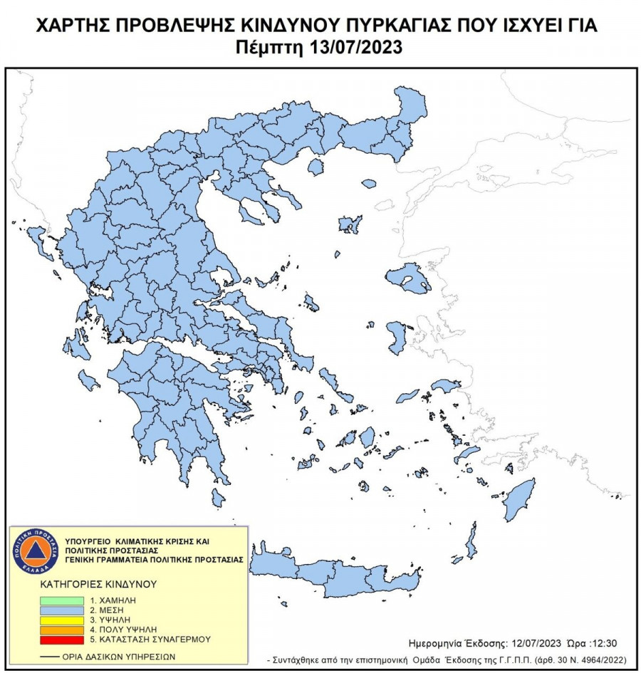 Σύμφωνα με το Χάρτη Πρόβλεψης Κινδύνου Πυρκαγιάς που εκδίδει η Γενική Γραμματεία Πολιτικής Προστασίας του υπουργείου Εσωτερικών και Διοικητικής Ανασυγκρότησης, για σήμερα Παρασκευή 7 Ιουλίου προβλέπεται κίνδυνος πυρκαγιάς κατηγορίας 2.