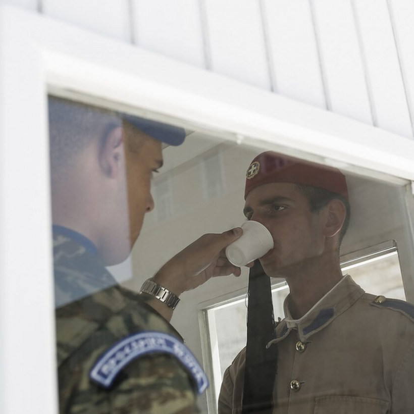 Οι εύζωνες της Προεδρικής Φρουράς παραμένουν στη θέση τους στο Μνημείο του Αγνώστου Στρατιώτη αν και «λιώνουν» από τον καύσωνα. Ο αξιωματικός που βρίσκεται στο πλευρό του συχνά του σκουπίζει τον ιδρώτα, ενώ του δίνει και νερό για να δροσιστεί για να αποφευχθεί έτσι ο κίνδυνος της θερμοπληξίας.