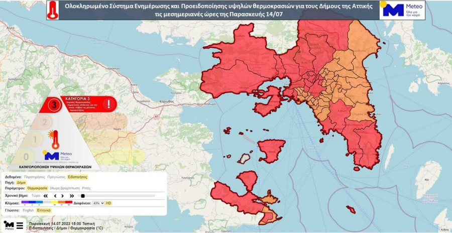 Πολύ υψηλές θερμοκρασίες θα σημειωθούν τις μεσημεριανές ώρες της Παρασκευής 14/07/2023 και στην Αττική, με το δείκτη κατηγοριοποίησης υψηλών θερμοκρασιών να εκτιμάται στο μέγιστο επίπεδο 3. Χαρακτηριστικός είναι ο Χάρτης 2 Προειδοποίησης Καιρικών Συνθηκών, όπου στους περισσότερους Δήμους της Αττικής η θερμοκρασία τις μεσημεριανές ώρες της Παρασκευής 14/07 θα φτάσει και τοπικά θα ξεπεράσει τους 40 °C (κόκκινη απόχρωση), ενώ στα ανατολικά και νοτιοδυτικά τμήματα, η μέγιστη θερμοκρασία αναμένεται να φτάσει τους 37 °C (πορτοκαλί απόχρωση).