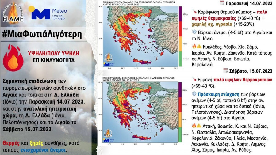 Παράλληλα, οι πολύ θερμές και ξηρές συνθήκες που ήδη επηρεάζουν το μεγαλύτερο τμήμα της χώρας μας έχουν ως αποτέλεσμα την επικράτηση πυρομετεωρολογικών συνθηκών ικανών να δυσχεράνουν τον έλεγχο δασικών πυρκαγιών που τυχόν εκδηλωθούν. Είναι σημαντικό να τονιστεί ότι έως και το Σάββατο 15 Ιουλίου 2023, η ευφλεκτότητα των νεκρών δασικών καυσίμων αναμένεται να είναι κρίσιμα υψηλή.