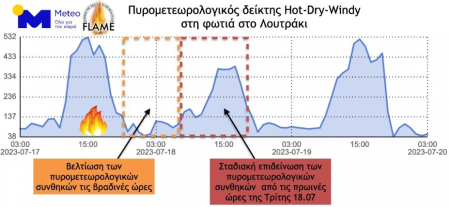 Mε βάση τα πιο πρόσφατα προγνωστικά στοιχεία του meteo.gr οι πυρομετεωρολογικές συνθήκες στην περιοχή της πυρκαγιάς στο Λουτράκι Κορινθίας αναμένεται να παρουσιάσουν βελτίωση κατά τις νυχτερινές ώρες της Δευτέρας 17.07 έως τις πρώτες πρωινές ώρες της Τρίτης 18.07, οπότε και αναμένεται σταδιακή βελτίωση λόγω της εξασθένησης των ανέμων.