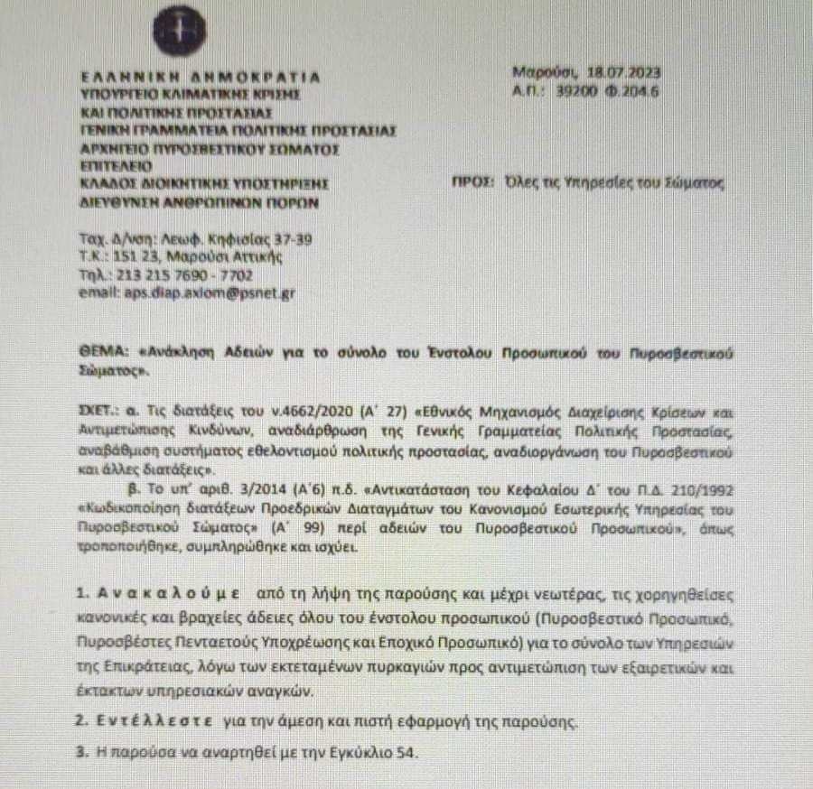 Ανακλήθηκαν οι άδειες των πυροσβεστών