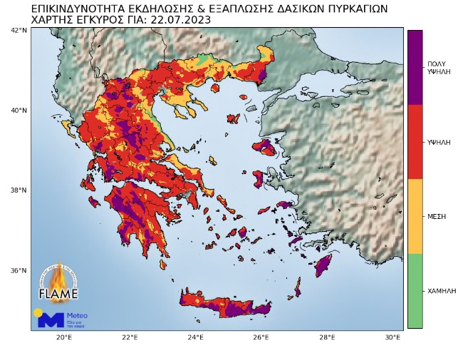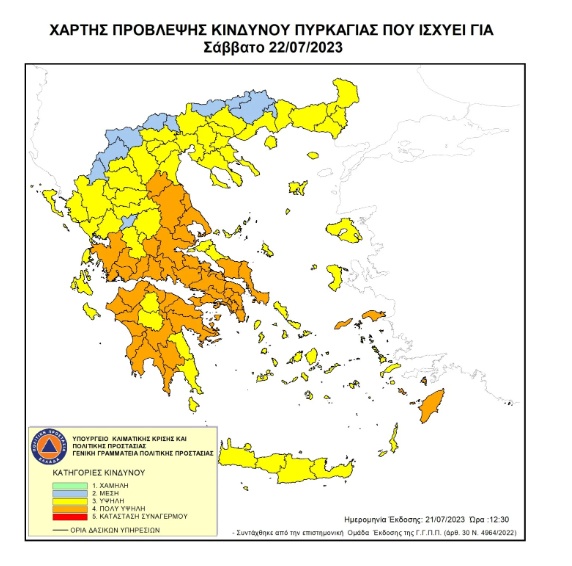 Πολύ υψηλός κίνδυνος για φωτιά (κατηγορία κινδύνου 4) προβλέπεται σήμερα, Σάββατο 22 Ιουλίου, για επτά περιφέρειες της χώρας, σύμφωνα με το Χάρτη Πρόβλεψης Κινδύνου Πυρκαγιάς που εκδίδει η γενική γραμματεία Πολιτικής Προστασίας του υπουργείου Κλιματικής Κρίσης και Πολιτικής Προστασίας (civilprotection.gov.gr).