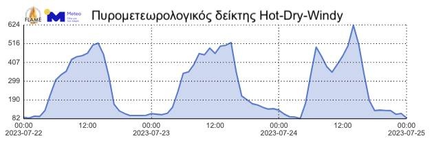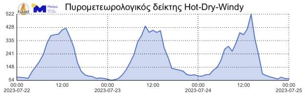 Εικόνα 3. Πυρομετεώγραμμα για το δυτικό μέτωπο της πυρκαγιάς στη Ρόδο. Οι υψηλότερες τιμές του δείκτη αντιστοιχούν σε δυσμενέστερες πυρομετεωρολογικές συνθήκες. Στις αναγραφόμενες ώρες προσθέστε +3 για τοπική ώρα.