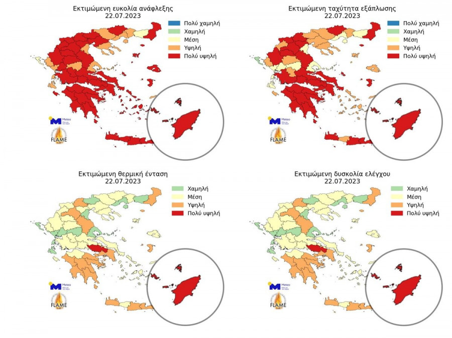 Εικόνα 2. Εκτιμώμενη ευφλεκτότητα, ταχύτητα εξάπλωσης, θερμική ένταση και δυσκολία ελέγχου δασικών πυρκαγιών το Σάββατο 22 Ιουλίου 2023. Επισημαίνεται με μεγένθυνση η περιοχή της Ρόδου.