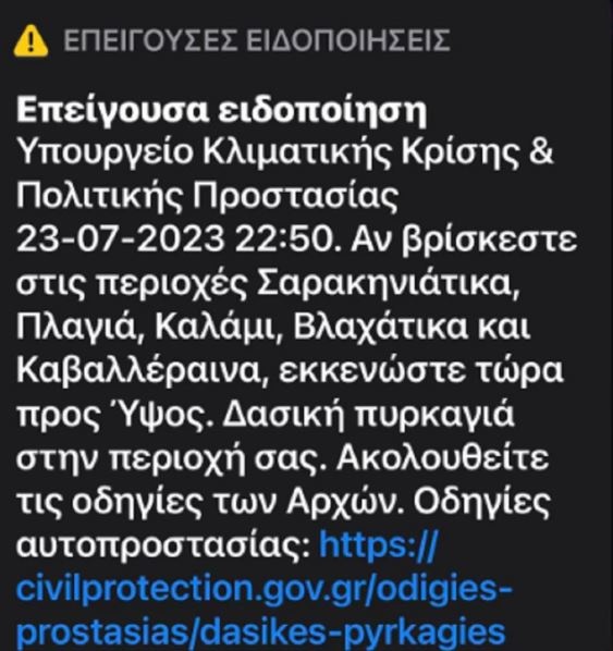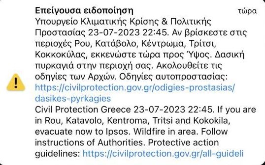 Είχε προηγηθεί από το 112 η ειδοποίηση που αφορούσε στους κατοίκους από Ρου, Κατάβολο, Κέντρωμα, Τρίτσι και Κοκκοκύλα να κατευθυνθούν πάλι προς Ύψος.