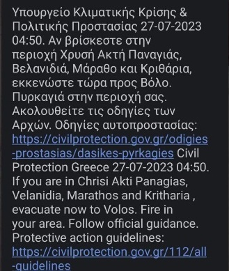 «Αν βρίσκεστε στις περιοχές Αλυκές, Πευκάκια, Άγιο Γεώργιο και Νέα Αγχίαλο παραμείνετε σε ετοιμότητα».