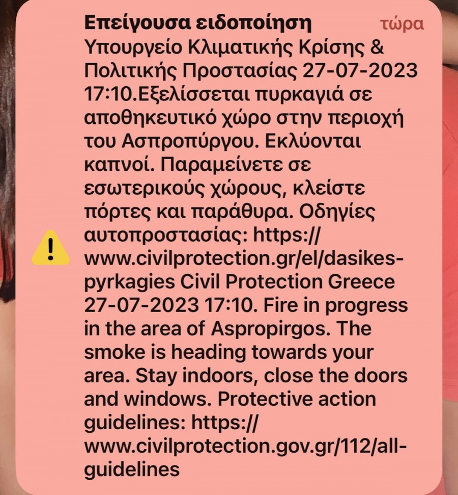 Λίγη ώρα αργότερα, στάλθηκε μήνυμα από την Πολιτική Προστασία, ζητώντας από τους κατοίκους του Ασπροπύργου να παραμείνουν σπίτια τους, λόγω των καπνών.