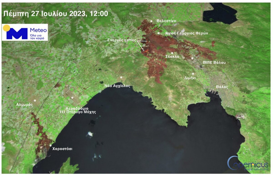 Στο κάτω αριστερό μέρος της εικόνας διακρίνεται επίσης η καμένη έκταση της πυρκαγιάς μεταξύ Αλμυρού και Χοροστασίου που στοίχισε τη ζωή σε μια γυναίκα την Τετάρτη 26/7.