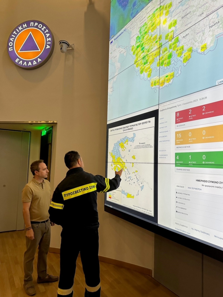 Στη συνέχεια έγινε ενημέρωση από Αξιωματικούς του Εθνικού Συντονιστικού Κέντρου Επιχειρήσεων και Διαχείρισης Κρίσεων (ΕΣΚΕΔΙΚ) για τον επιχειρησιακό συντονισμό στο πλαίσιο εκπλήρωσης της αποστολής του Πυροσβεστικού Σώματος.