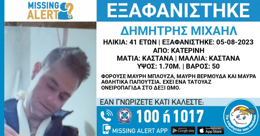 Εξαφανίστηκε από την περιοχή της Κατερίνης το Σάββατο 5 Αυγούστου ο Δημήτρης Μιχαήλ, 41 ετών.