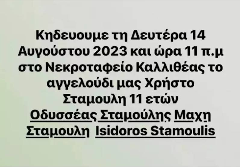 Στην διαδικτυακή ανακοίνωση αναφέρεται: «Κηδεύουμε τη Δευτέρα 14 Αυγούστου 2023 και ώρα 11 π.μ., στο Νεκροταφείο Καλλιθέας, το αγγελούδι μας Χρήστο Σταμούλη 11 ετών».