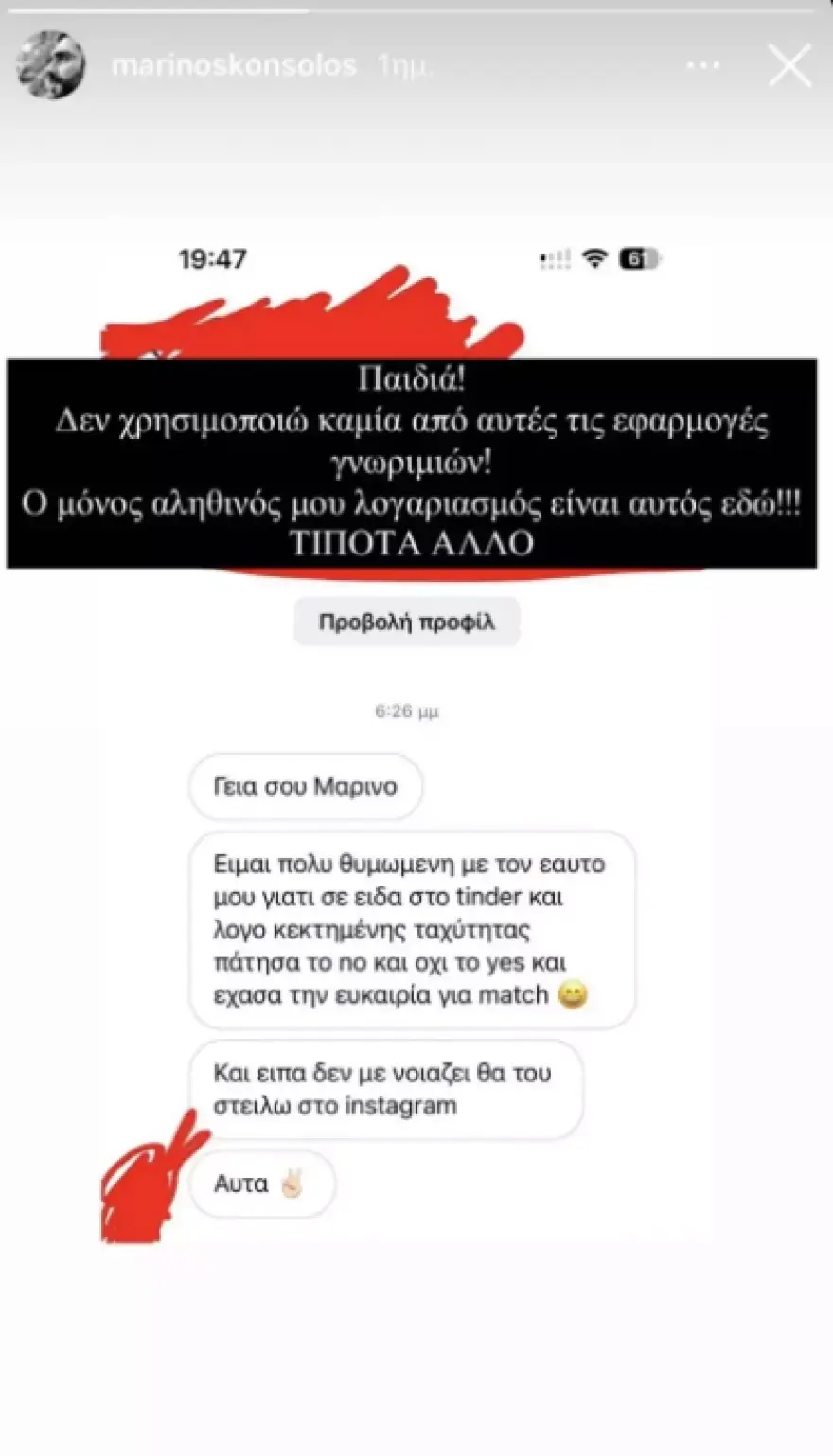 «Γεια σου, Μαρίνο. Είμαι πολύ θυμωμένη με τον εαυτό μου, γιατί σε είδα στο Tinder και λόγω κεκτημένης ταχύτητας πάτησα το "no" κι όχι το "yes" κι έχασα την ευκαιρία για match. Κι είπα "δεν με νοιάζει, θα του στείλω στο Instagram". Αυτά», έγραφε η κοπέλα.