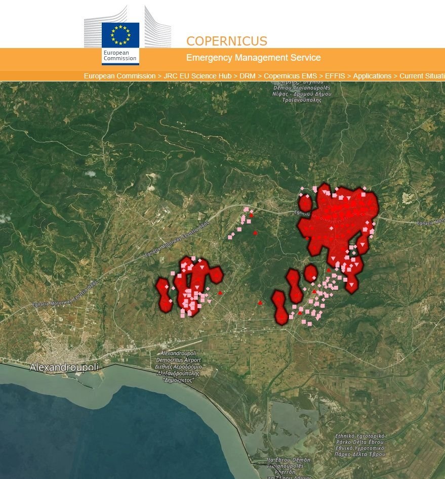 Η υπηρεσία διαχείρισης έκτακτης ανάγκης «Copernicus» παρουσιάζει δορυφορική εικόνα από τις καμένες εκτάσεις και τα ενεργά μέτωπα της πυρκαγιάς.