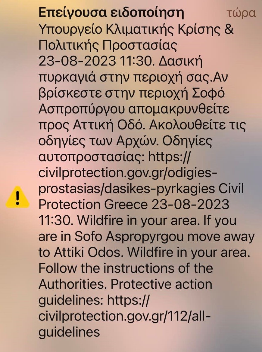 «Δασική πυρκαγιά στην περιοχή σας. Αν βρίσκεστε στην περιοχή Σοφό Ασπροπύργου απομακρυνθείτε προς Αττική Οδό. Ακολουθείστε τις οδηγίες των Αρχών»