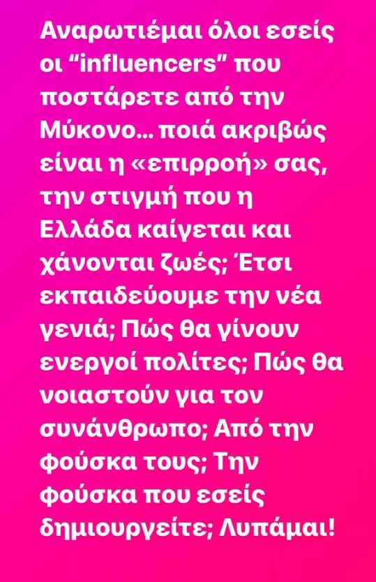 «Αναρωτιέμαι, όλοι εσείς οι “influencers” που ποστάρετε από τη Μύκονο… Ποια ακριβώς είναι η επιρροή σας, τη στιγμή που η Ελλάδα καίγεται και χάνονται ζωές; Έτσι εκπαιδεύουμε τη νέα γενιά; Πώς θα γίνουν ενεργοί πολίτες; Πώς θα νοιαστούν για το συνάνθρωπο; Από τη φούσκα τους; Από τη φούσκα που εσείς δημιουργείτε; Λυπάμαι…», έγραψε στην ανάρτησή της η Εριέττα Κούρκουλου.