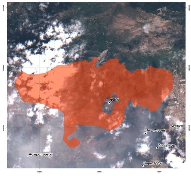 Αντίστοιχα έκταση μεγαλύτερη των 50.000 στρεμμάτων έχει κατακάψει μέχρι σήμερα η πυρκαγιά στη Φυλή της Αττικής.