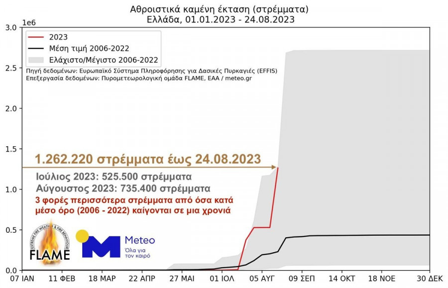 -Η έκταση που έχει καεί έως την Τετάρτη 23.08.2023 αντιστοιχεί σε περίπου 3 φορές την έκταση που κατά μέσο όρο (2006 - 2022) καίγεται ετησίως στη χώρα μας.