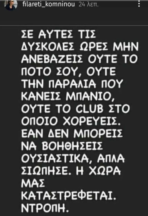 Συγκεκριμένα, στο story της η Φιλαρέτη Κομνηνού έγραψε: «Σε αυτές τις δύσκολες ώρες μην ανεβάζεις ούτε το ποτό σου, ούτε την παραλία που κάνεις μπάνιο, ούτε το club στο οποίο χορεύεις. Εάν δεν μπορείς να βοηθήσεις ουσιαστικά, απλά σιώπησε. Η χώρα μας καταστρέφεται. Ντροπή».