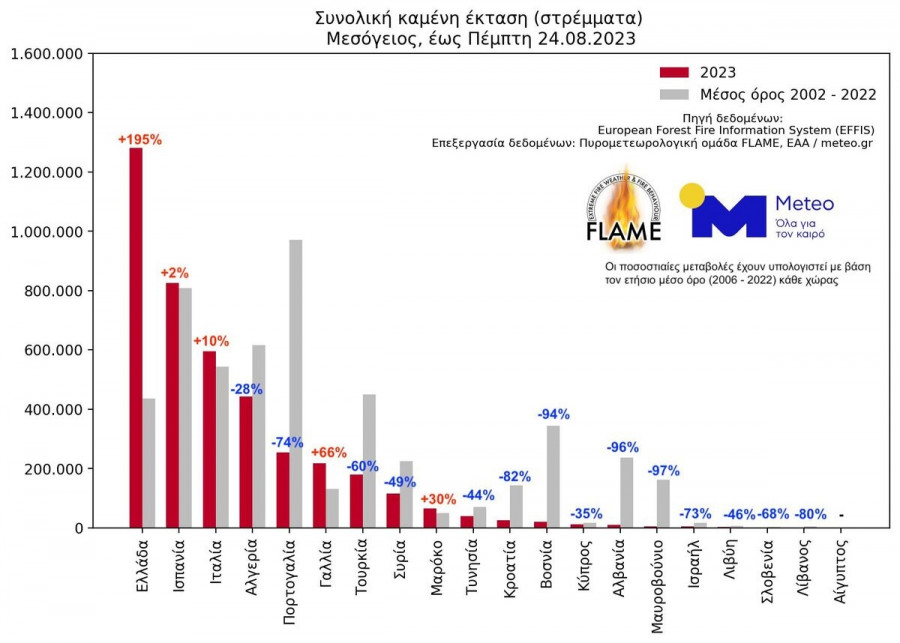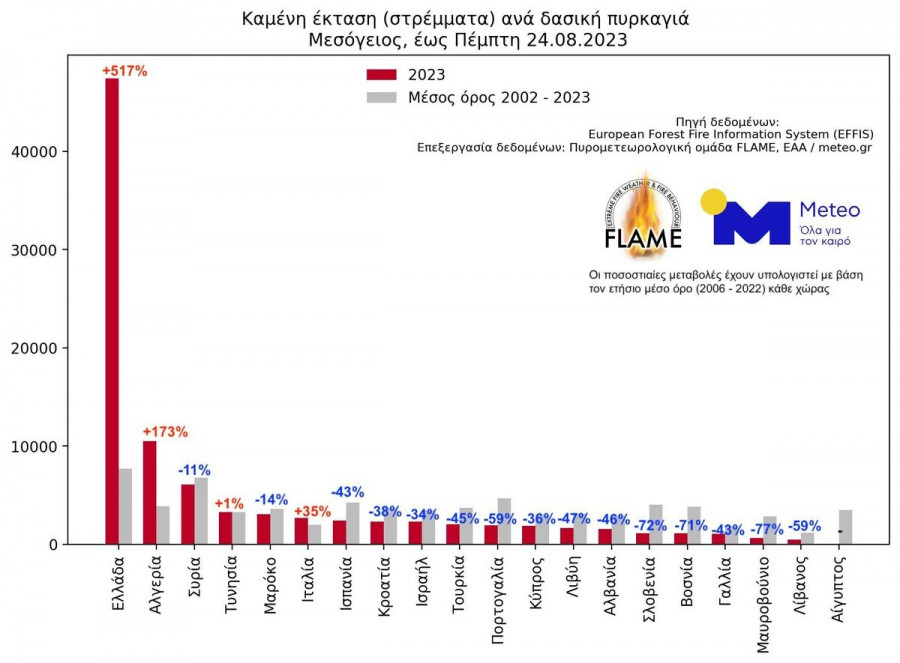 Καταγράφοντας 1.281.480 στρέμματα καμένων εκτάσεων έως την Πέμπτη 24.08.2023, η Ελλάδα κατατάσσεται πρώτη μεταξύ 20 Μεσογειακών χωρών. Δεύτερη έρχεται η Ισπανία με 824.640 στρέμματα και τρίτη η Ιταλία με 595.330 στρέμματα. Αύξηση των καμένων εκτάσεων καταγράφουν επίσης η Γαλλία (+66%) και το Μαρόκο (+30%), ενώ μείωση καταγράφεται στις υπόλοιπες χώρες.