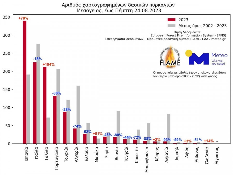 Ο αθροιστικός αριθμός των μεγάλων δασικών πυρκαγιών (>300 στρέμματα) στην Ελλάδα, από την αρχή του έτους έως και την Πέμπτη 24.08.2023, καταγράφει μείωση -52% σε σύγκριση με τον αριθμό μεγάλων δασικών πυρκαγιών που κατά μέσο όρο (2002 - 2022) εκδηλώνονται στη χώρα μας σε ετήσια κλίμακα. Αύξηση του αριθμού των δασικών πυρκαγιών καταγράφεται σε Ισπανία (+78%), Γαλλία (+194%), Μαρόκο (+51%), Κύπρο (+2%), Λιβύη (+3%) και Σλοβενία (+14%).